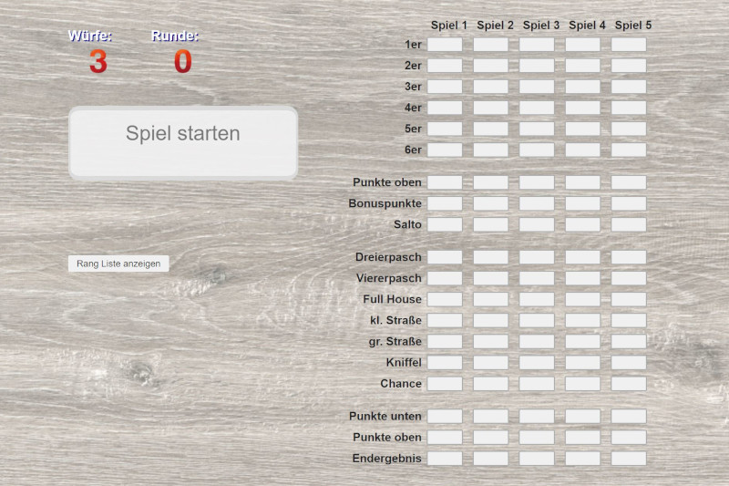 Spiel starten Der Button startet das Spiel mit dem ersten Wurf. Die Würfel werden per Würfeln-Button erneut geworfen. In einer Rund können die Würfel dreimal geworfen werden, danach muss ein Feld im Blatt angeklickt werden um das Würfelergebnis einzutragen. Nach der Eintragung werden die Würfel automatisch für die nächste Runde geworfen.